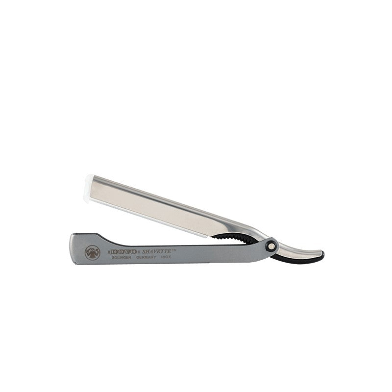 Interchangeable shavette razor from the German manufacturer Dovo, made of stainless steel, both the blade is made of polished steel 1.4301 and the handle is made of steel 1.4016 with a matt finish. It has a plastic sleeve to hold the blade and offer greater security in the change.